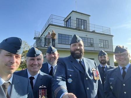 While at Tholthorpe, a local resident recommended visiting a local pub where photos and memorabilia of the RCAF Sqns still hung on the walls. He also stated that the control tower of the former RAF Tholthorpe airfield was intact and converted into a family home. The group felt like they were following a bouncing ball through history and decided it was a fitting to make a surprise (unannounced) visit to the former control tower. Driving up to the residence, the group were met by current owners Paul and Rosy Walker who graciously opened their family home and pointed out historical features of the former airfield from the unobstructed view. A photo album displayed pictures of the wartime era while a plaque on the outside of the home, set between red maples displays honour to those RCAF Sqns who served there during the war.