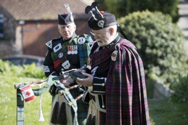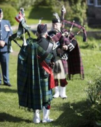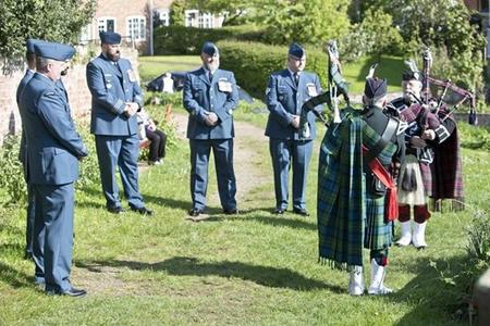 Pipers play and reflect at the crash site and monument of Halifax Bomber NA612 at Brafferton, Yorkshire. Six RCAF mbrs and one RAF mbr were killed. Photo Simon Penson